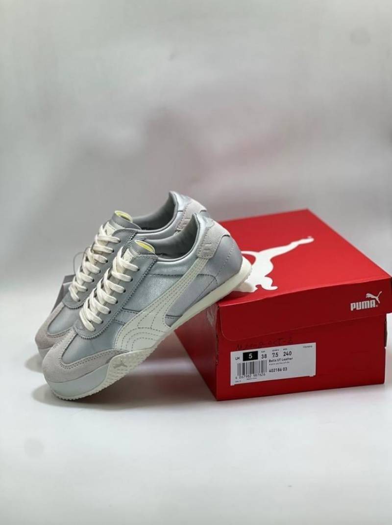 • WMN Pumma Bella UT Leather Womens sneaker in white and silver.